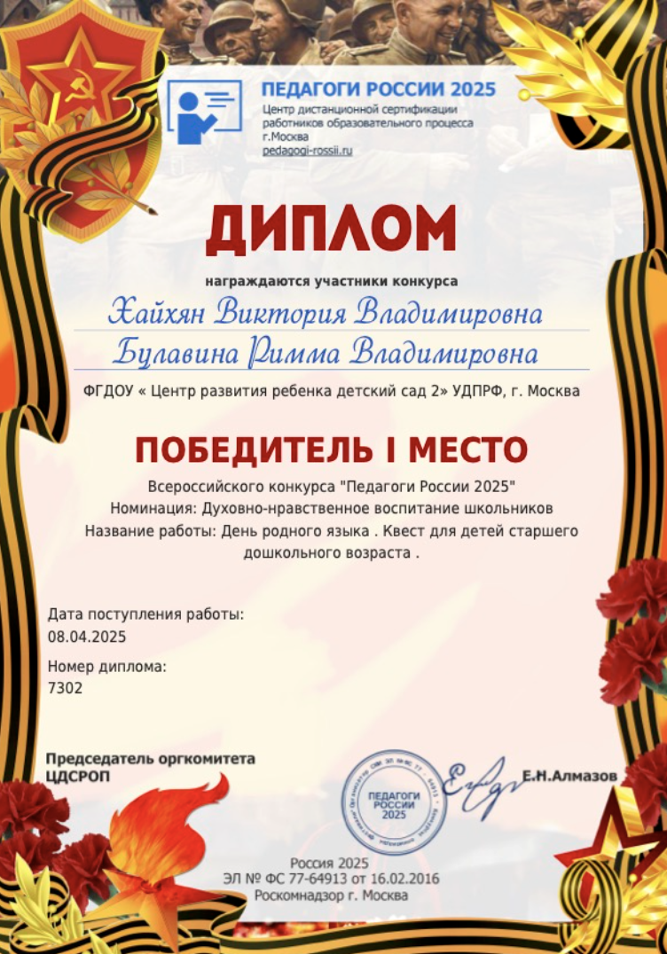 Диплом участника конкурса.Номинация: Духовно -нравственное воспитание дошкольников. Квест "День родного языка".