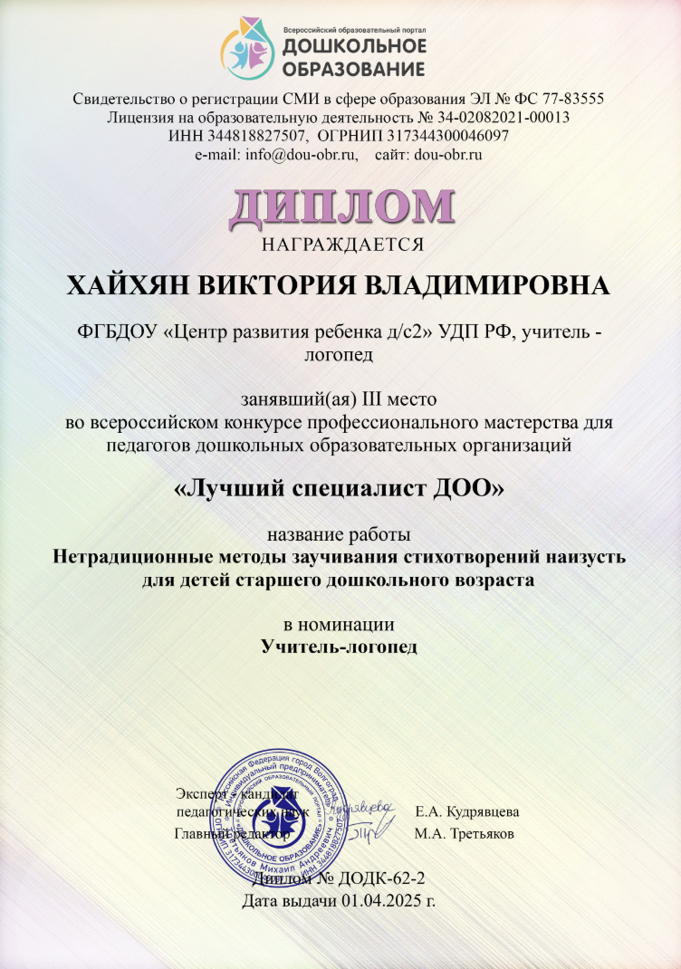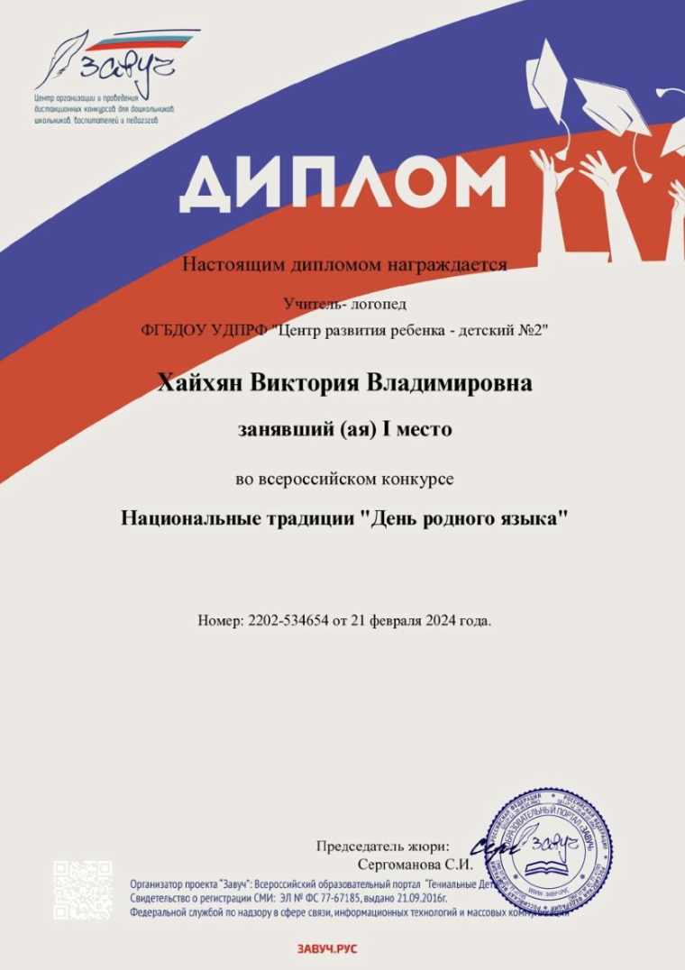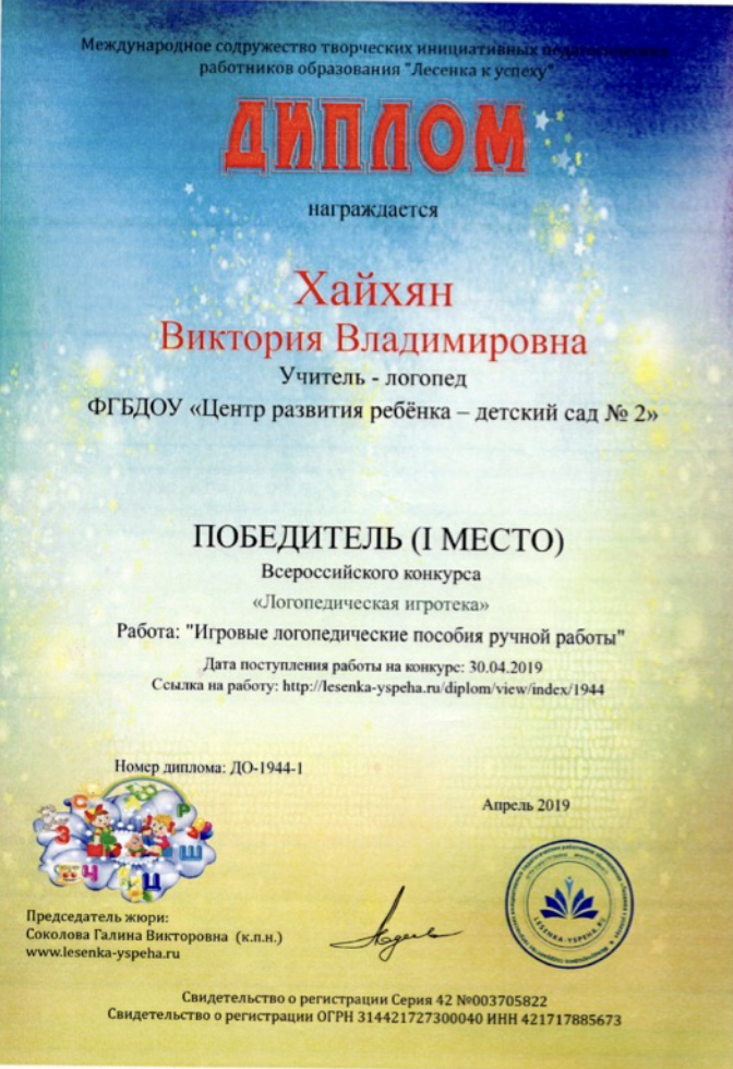Диплом всероссийского конкурса "Логопедическая игротека". Работа "Игровые логопедические пособия своими руками".