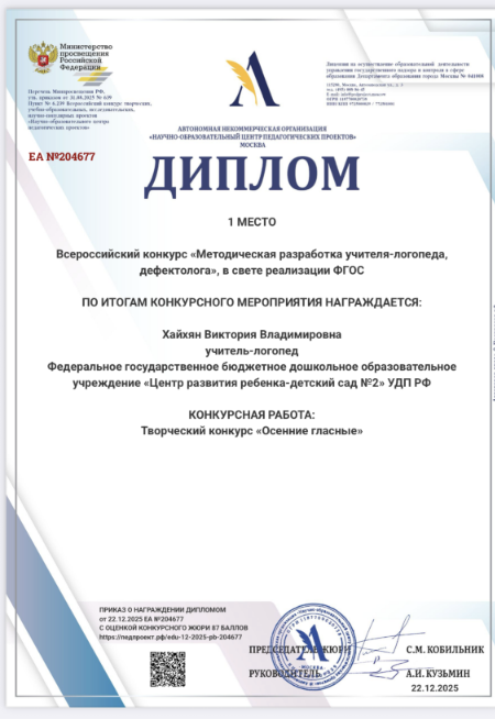Диплом Всероссийского конкурса "Методическая разработка учителя-логопеда, дефектолога". 22.12.2025г.