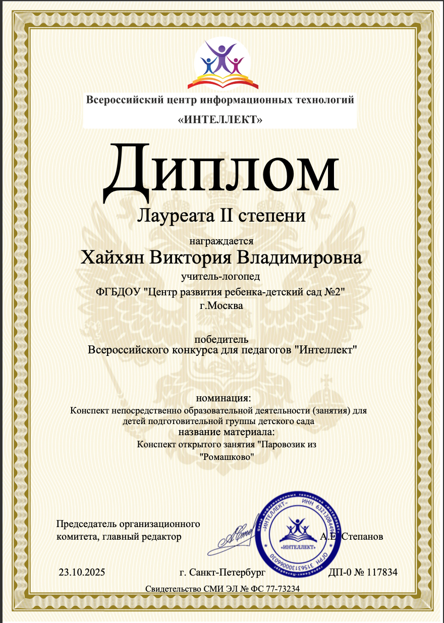 Диплом победителя Всероссийского конкурса для педагогов "Интеллект". номинация: Конспект непосредственной образовательной деятельности (занятия) детей подготовительной группы. 23.10.2025г.