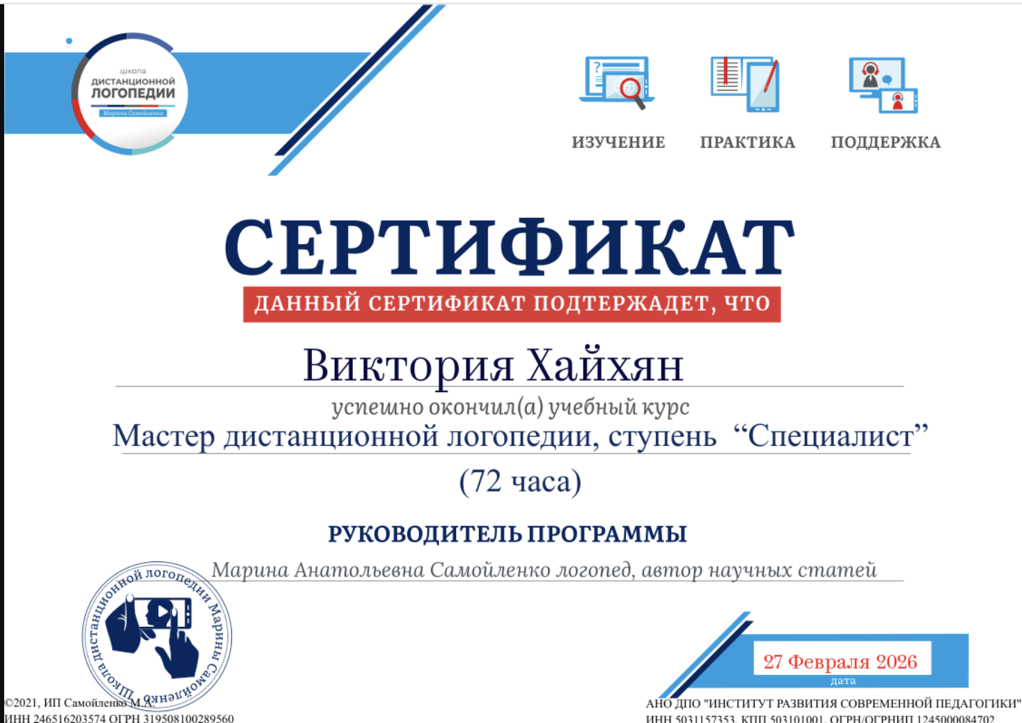 Сертификат прохождения 1 ступени "Специалист" программы "Онлайн-логопед". 27.02.2026г.