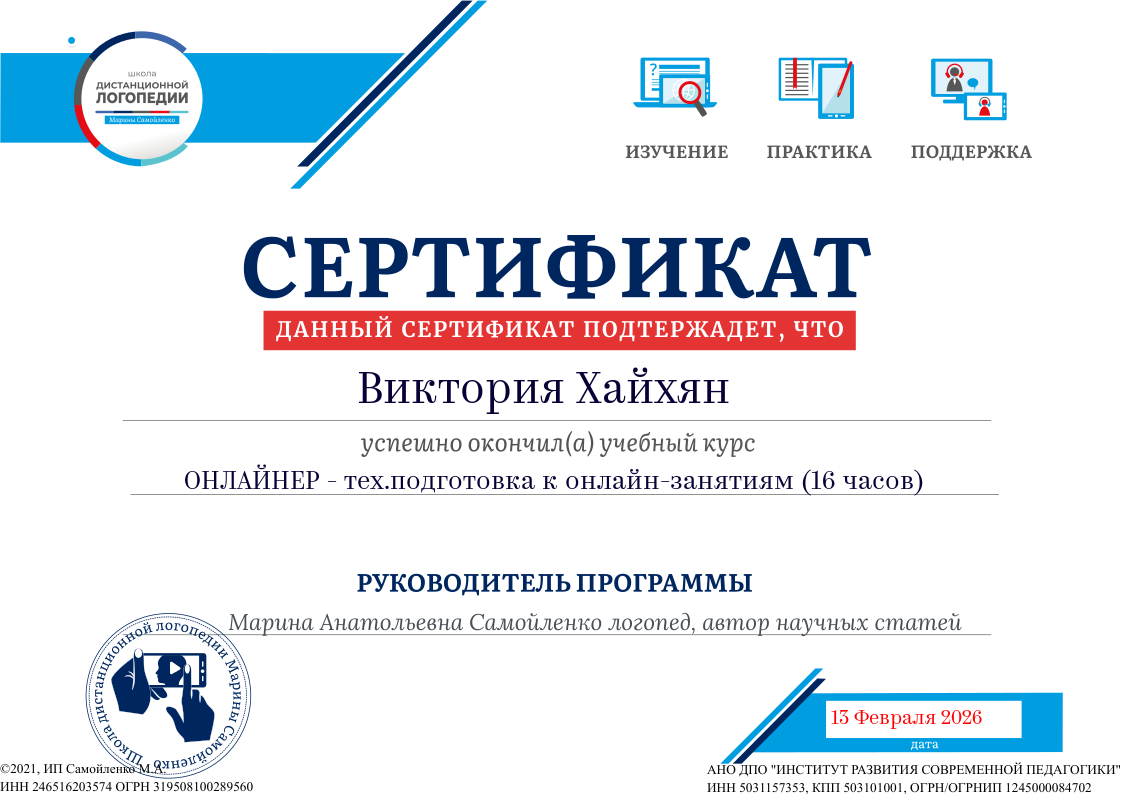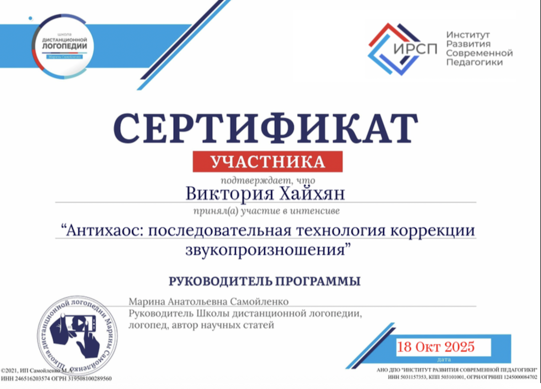 Сертификат участника в вебинаре-интенсиве "Антихаос:последовательная технология коррекции звукопроизношения". Школа дистанционной логопедии.18.10.2025г.