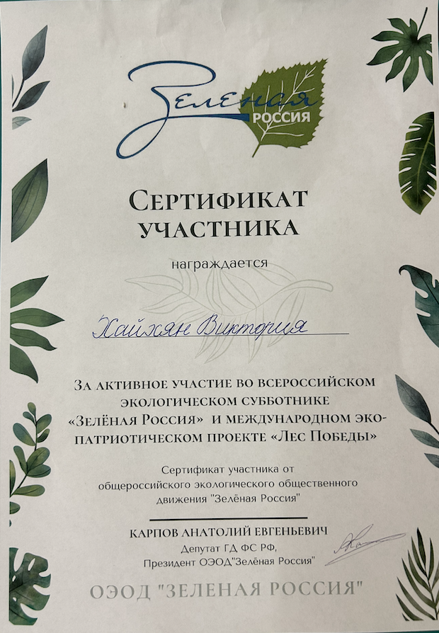 Сертификат участника экологического субботника "Зеленая Россия". 06.09. 2025г.