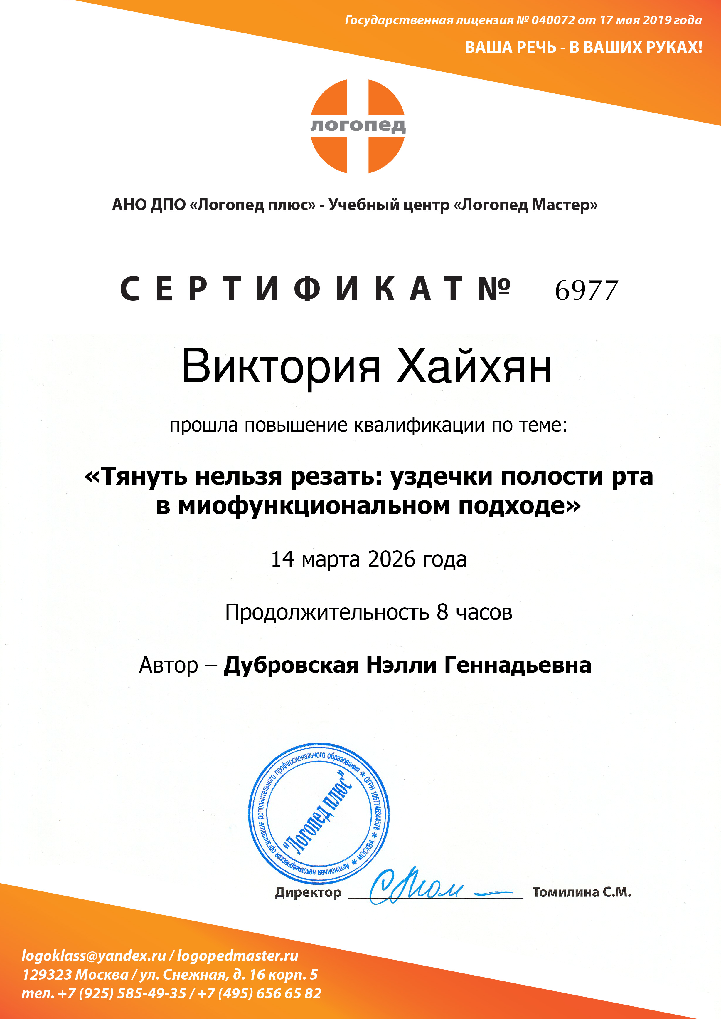 Сертификат о прохождении курса " Тянуть нельзя резать: уздечки полости рта в миофункциональном подходе" 14.03.2026г.