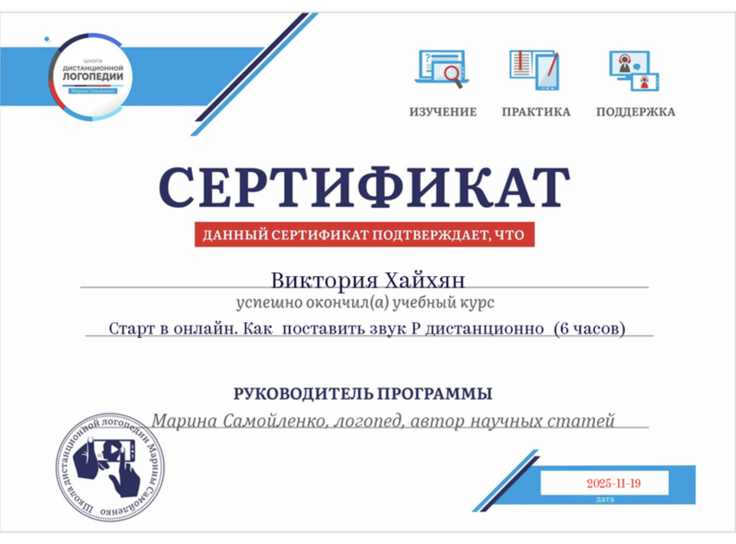 Сертификат прохождения программы "Стар в онлайн. Как поставить звук Р дистанционно" (6 часов). Школа дистанционной логопедии.1.11.2025г.
