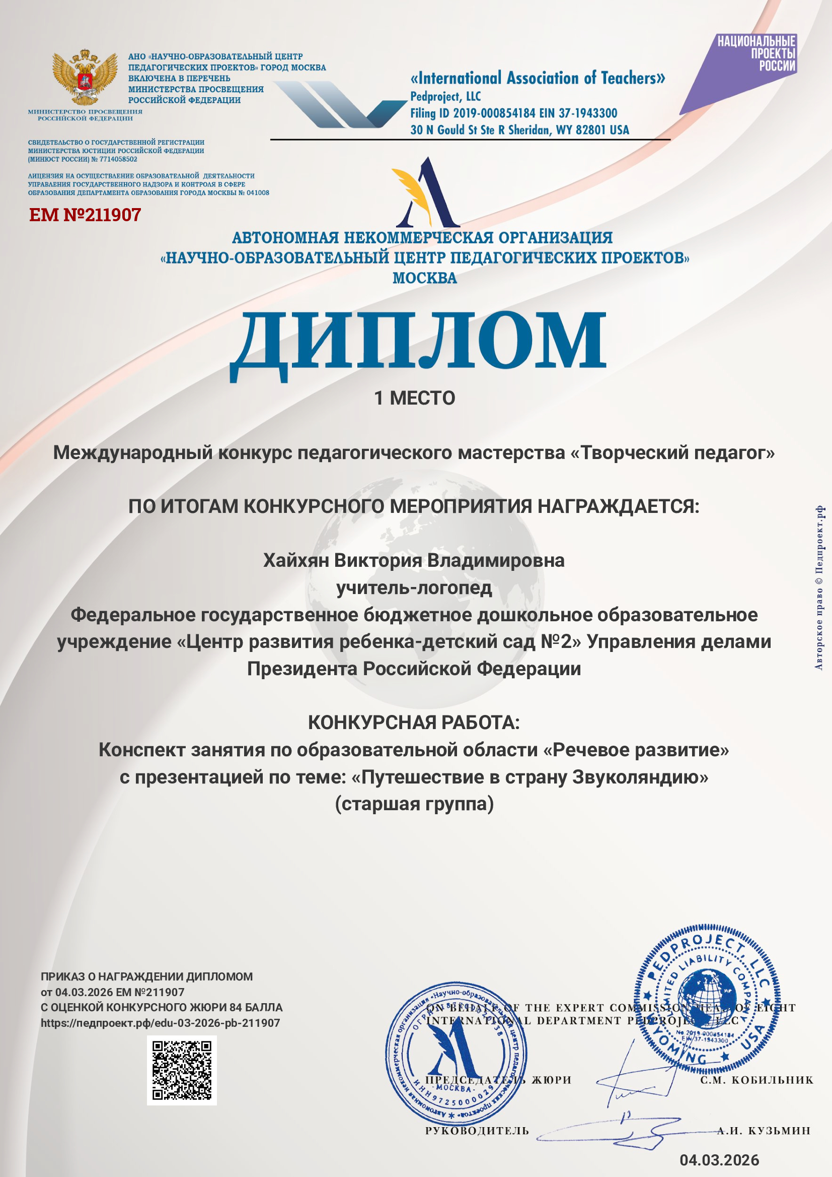 Диплом международного конкурса педагогического мастерства "Творческий педагог". Конкурсная работа: конспект занятия по образовательной области "Речевое развитие" с презентацией на тему "Путешествие в страну Звуколяндию"(старшая группа)