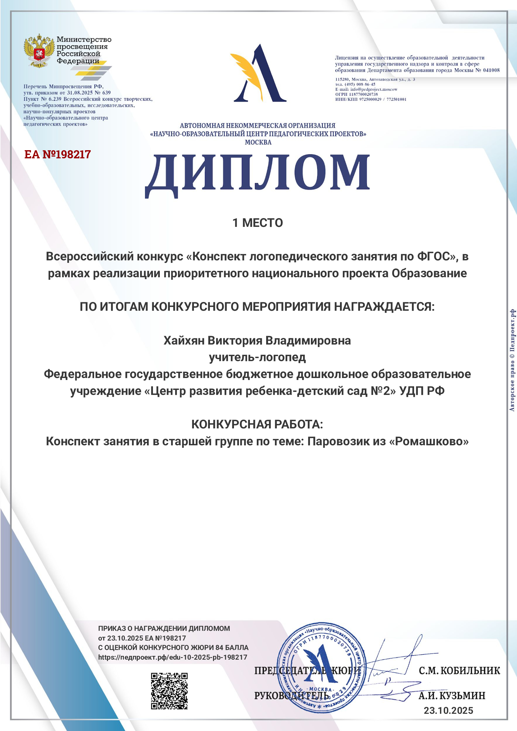 Диплом Всероссийского конкурса " Конспект логопедического занятия по ФГОС". 23.10.2025г.
