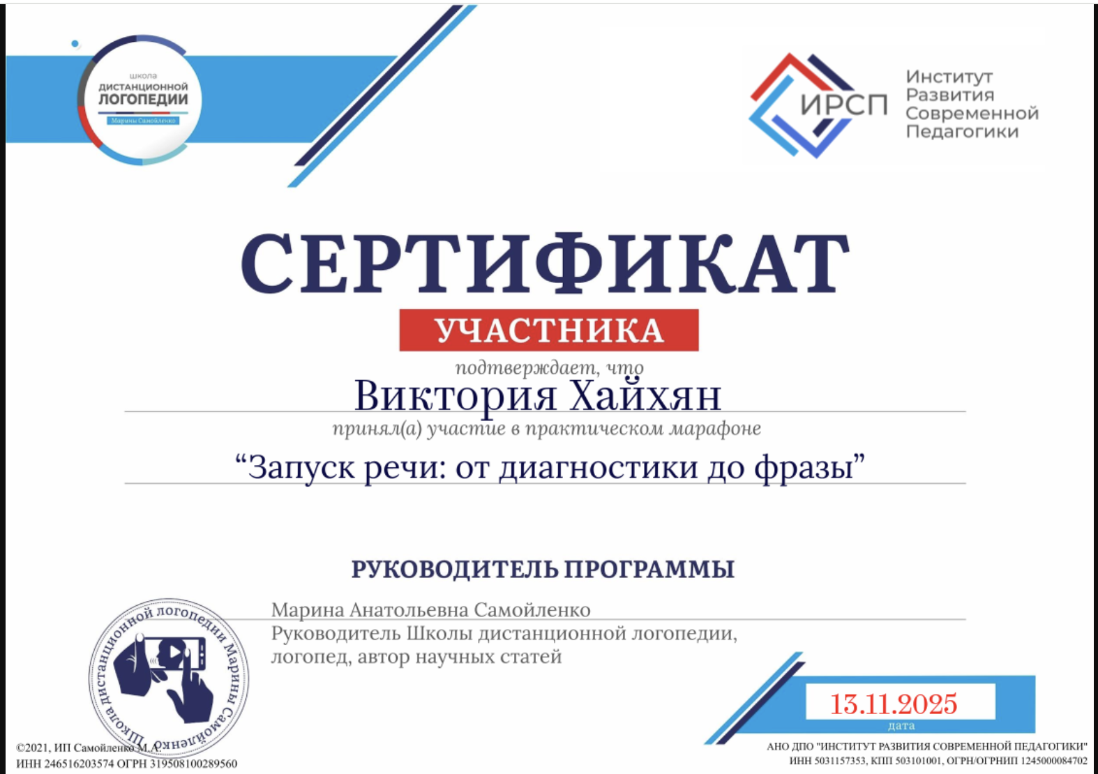 Сертификат участия в практическом марафоне "Запуск речи: от диагностики до фразы". Школа дистанционной логопедии . 13.11.2025г.