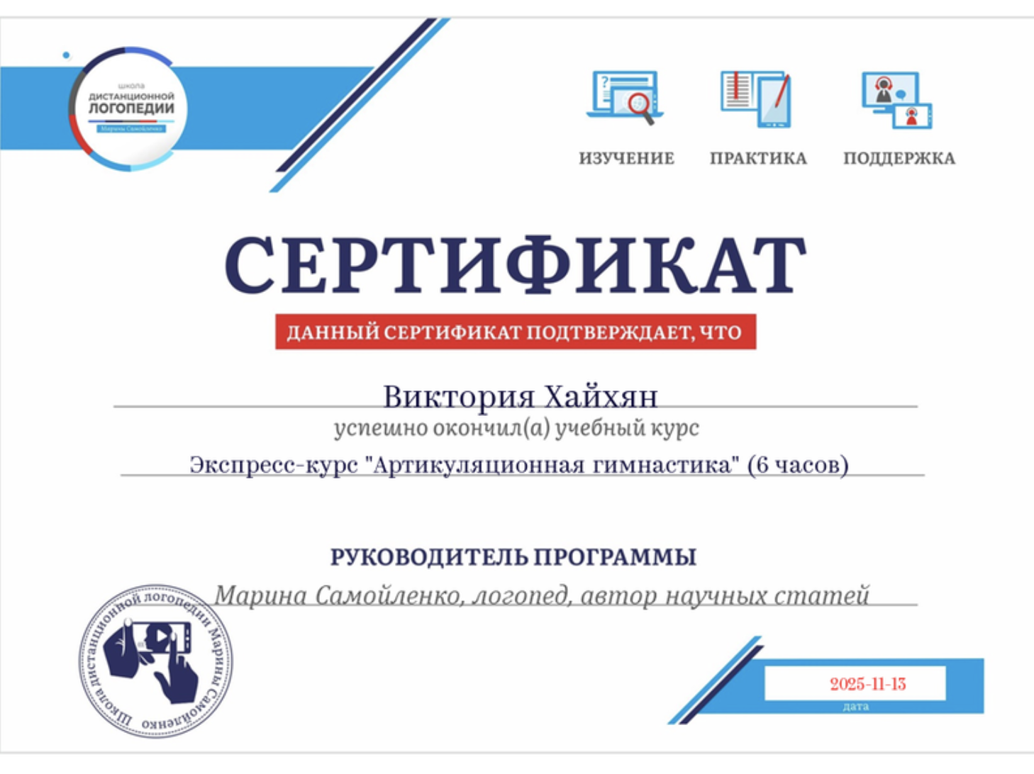 Сертификат о прохождении курс а "Артикуляционная гимнастика"(6 часов). Школа дистанционной логопедии. 13.11.2025г.
